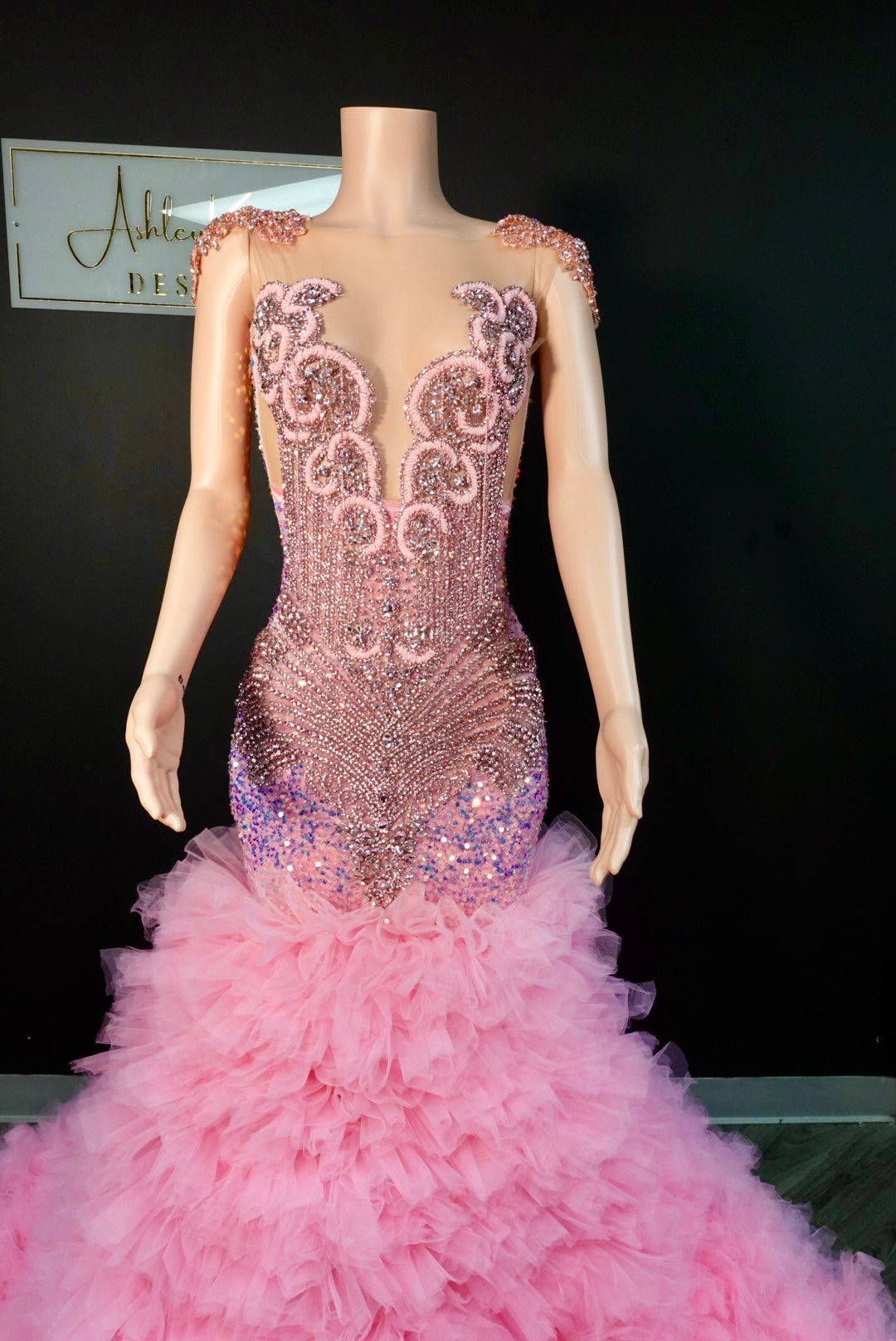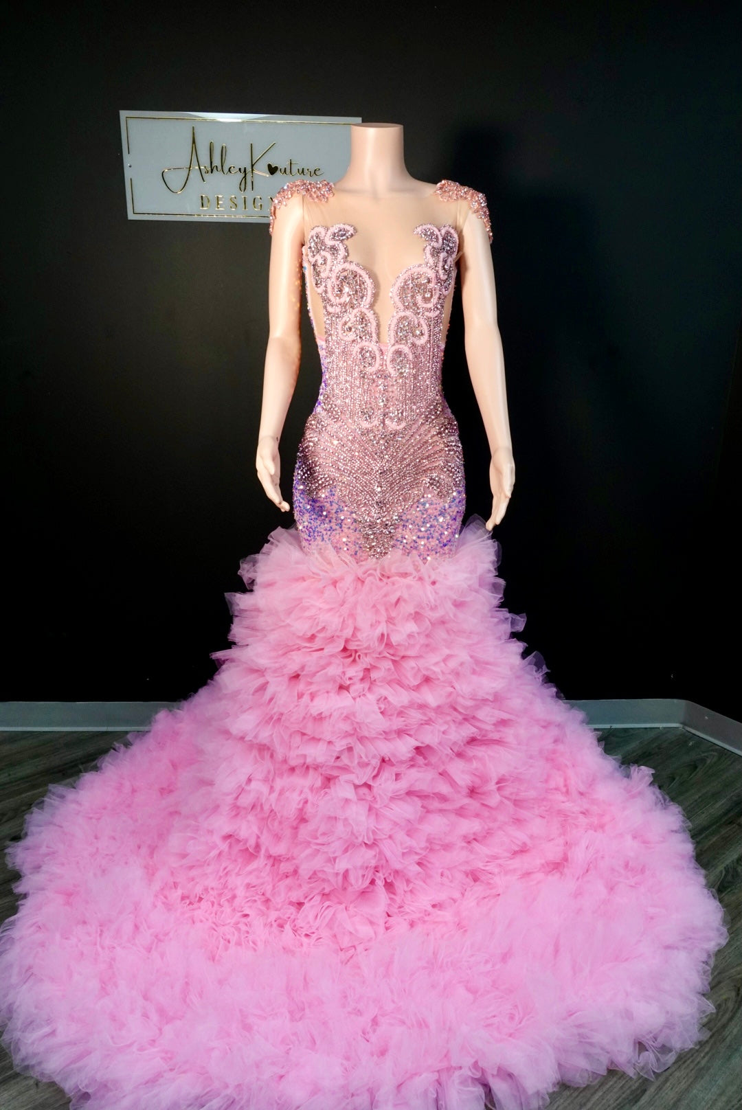 $250.00 deposit required to hold. This beautiful custom is made of sequin stretch material. It has a right side split.